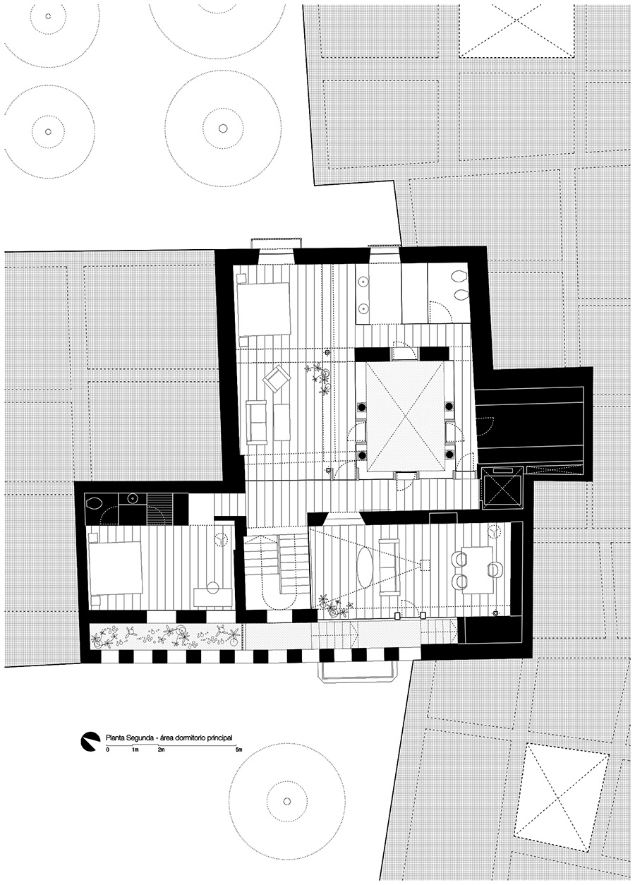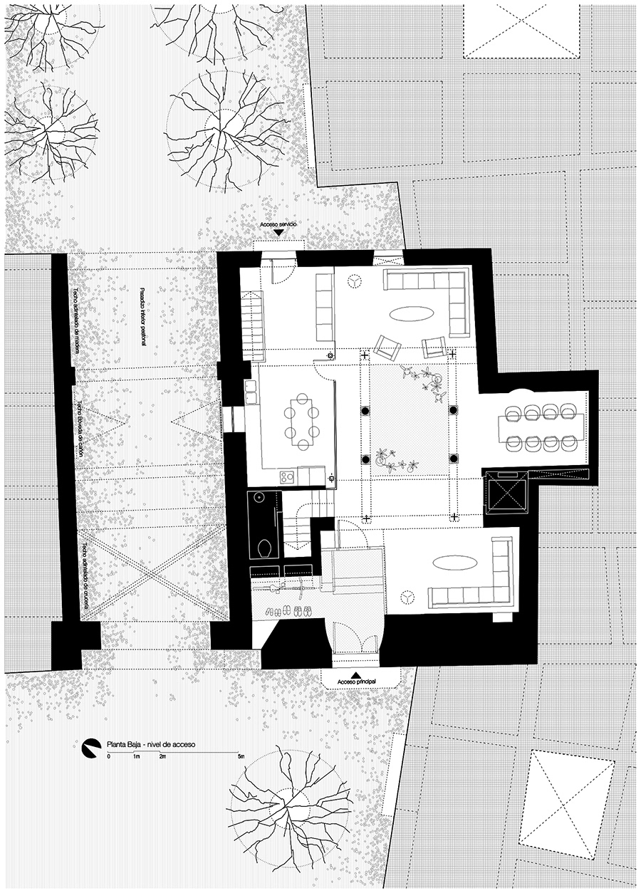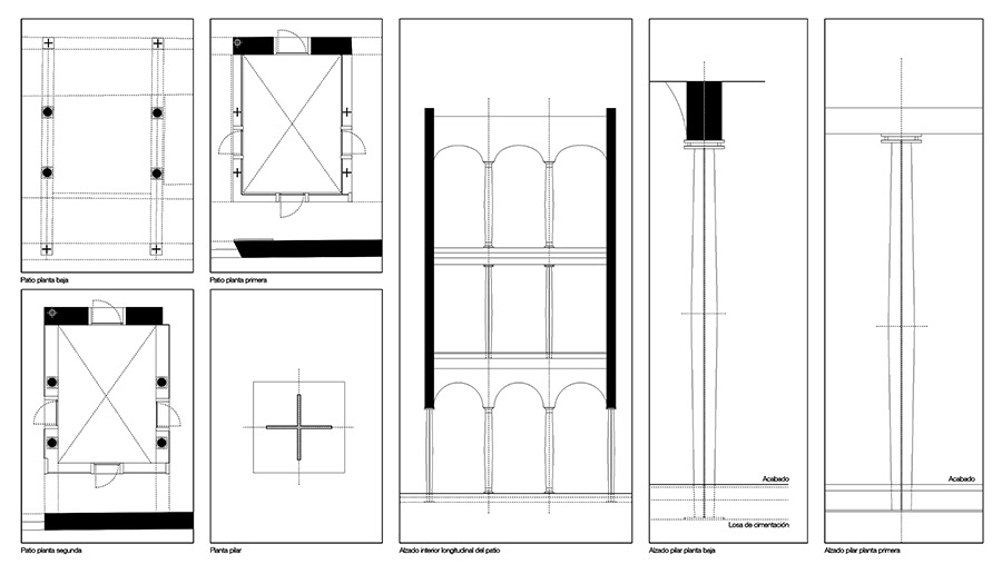 Walls around patio has lost their thickness and their clearly defined limits. They are replaced by metallic structures that reinterpret and give continuity to existing stone pillars. In contrast, current openings and balconies acquire thickness and refer to their original position and shape.