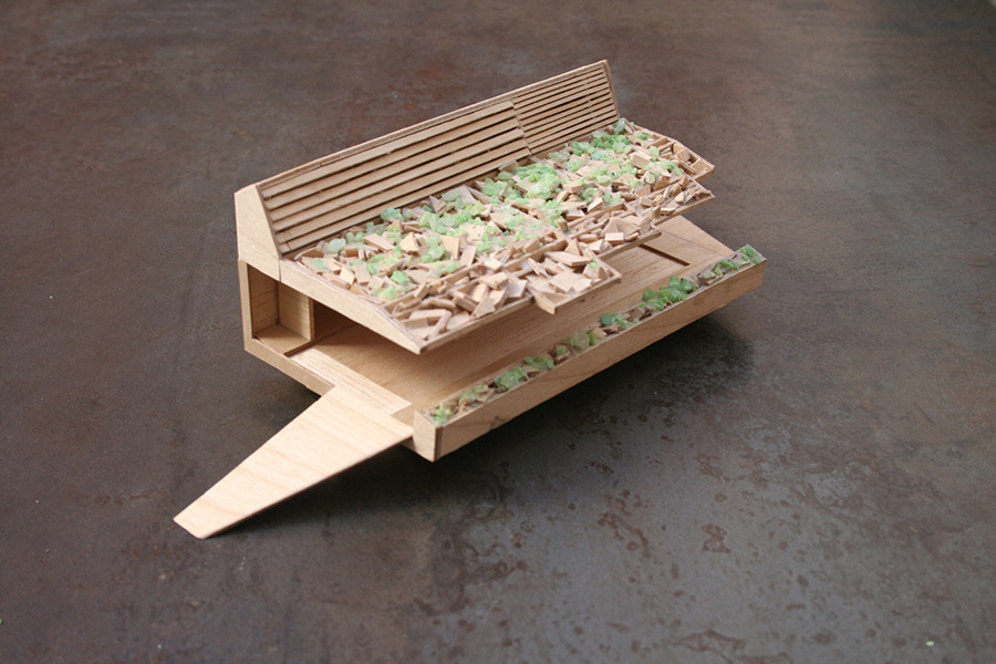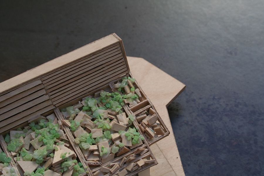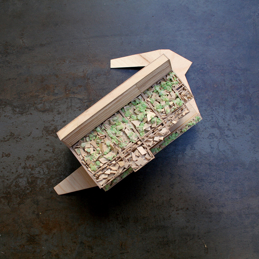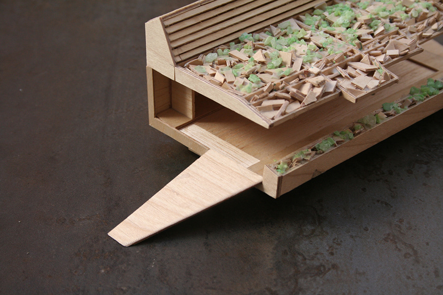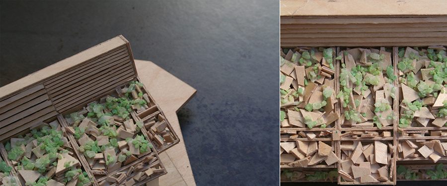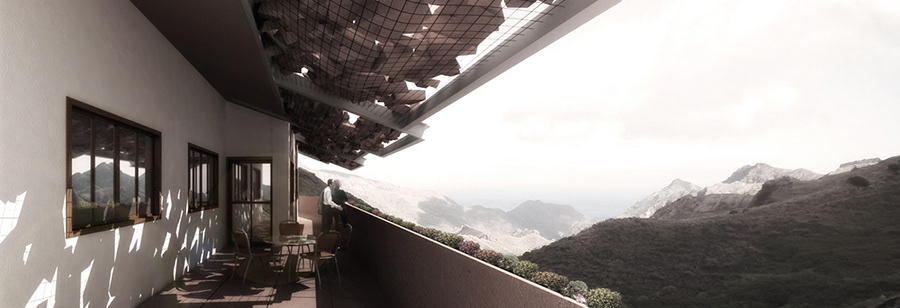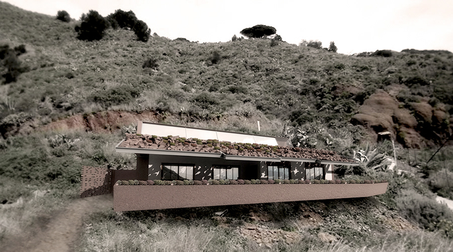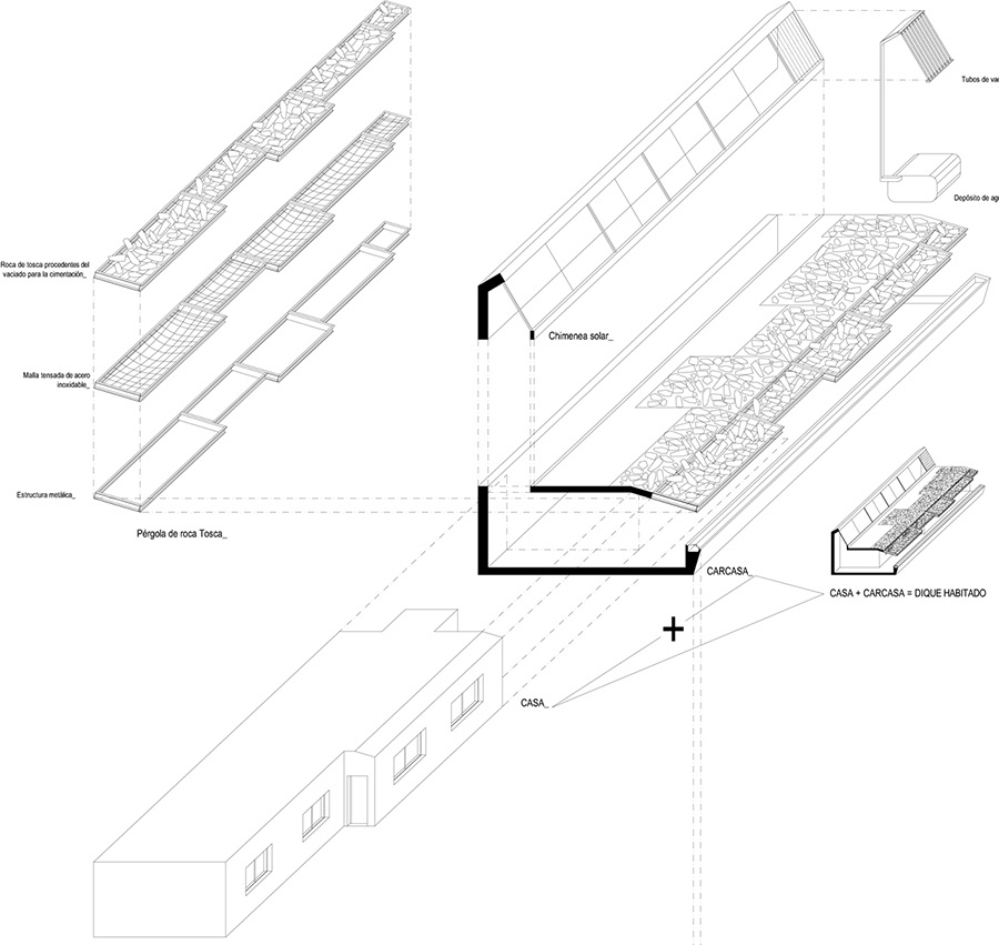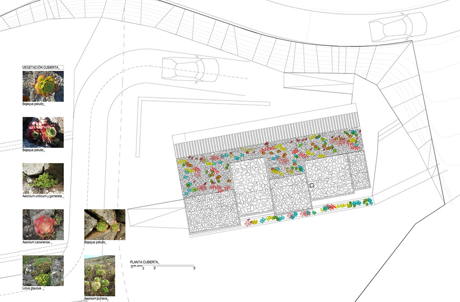 In the same way the proposal shares the same aspiration, it pretends to disappear, by imitating an weathered rock coated by vegetation. The outercasing it´s covered by rocks of the surroundings, and not only the facades, but the roofing also, it´s formed from irregular rocks through which the following vegetation will grow: houseleek from Aeonium genus, that don´t need deep soil but cracks.