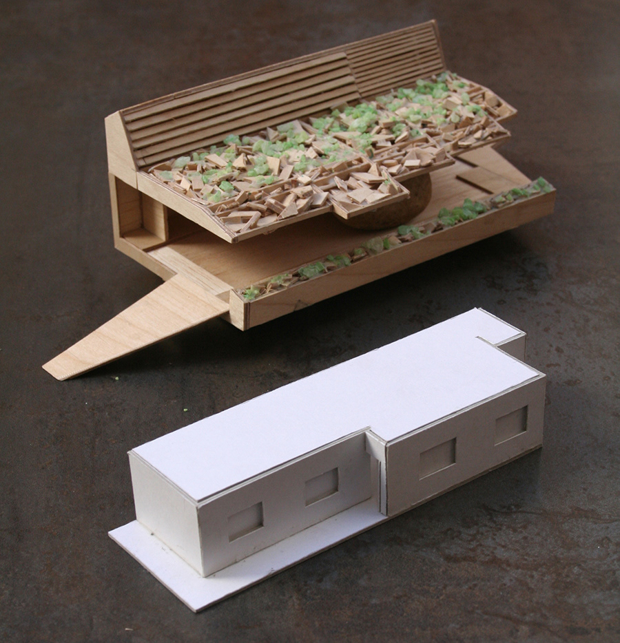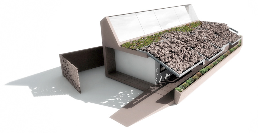 The rocks needed for the roofing will be provided from the excavation of the foundation. They would be placed on the roofing in irregular rows from East to West stacked like the ridge of a furrow separated one meter and a height of 40 cm. The different vegetation will be placed on the sides and tops and in the middle little stones and earth.
