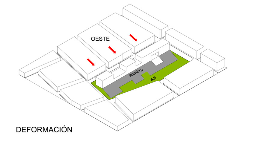 To avoid the building having an impact on the existing constructions, which range from three-storey single-family houses to apartment blocks with four or five storeys. The proposal is not located on the plot’s limits but is set back 8 m towards Nueve de Octubre Street.