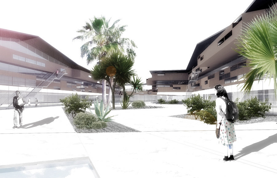 Our proposal occupies 50% of the site. The limit: the wall-vegetable plot. The building is structured as a ‘wall’, as a recreation of La Laguna fences.