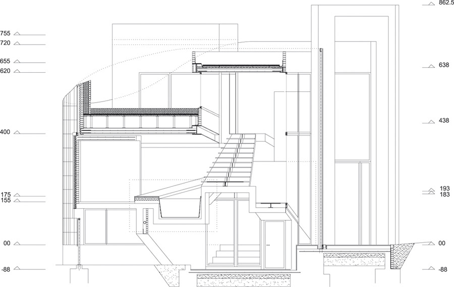 A translucent curtain that merges with the background, which receives a world of reflections and shadows. The Love House dissolves into its surroundings, multiplying with it.