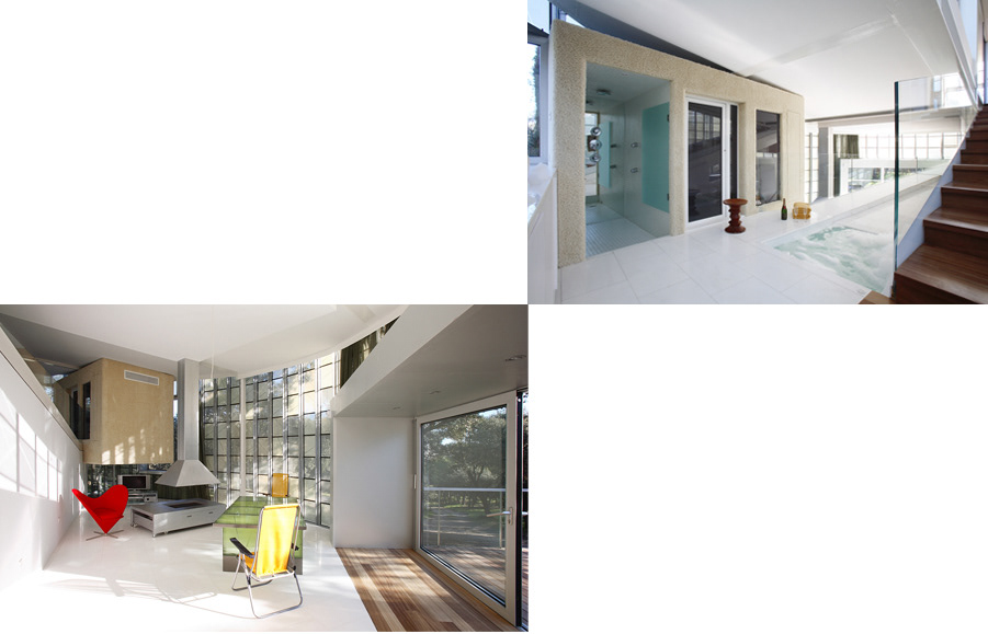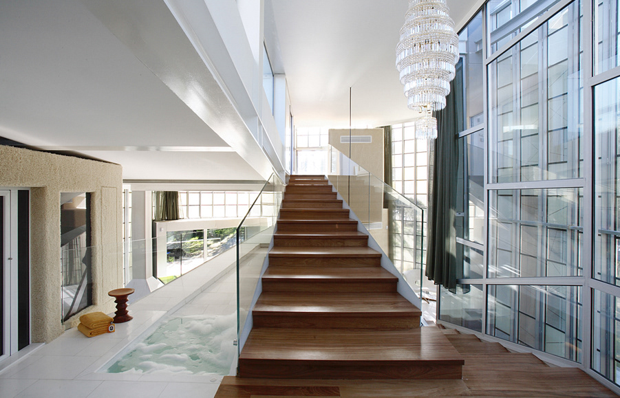The curtain in turn envelops the couple’s intimate space, almost like making out the continuous movements in the interior through a low mist: coming home, water, a reflection, undressing, the jacuzzi, the bedroom and the tree tops…