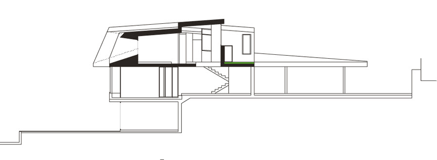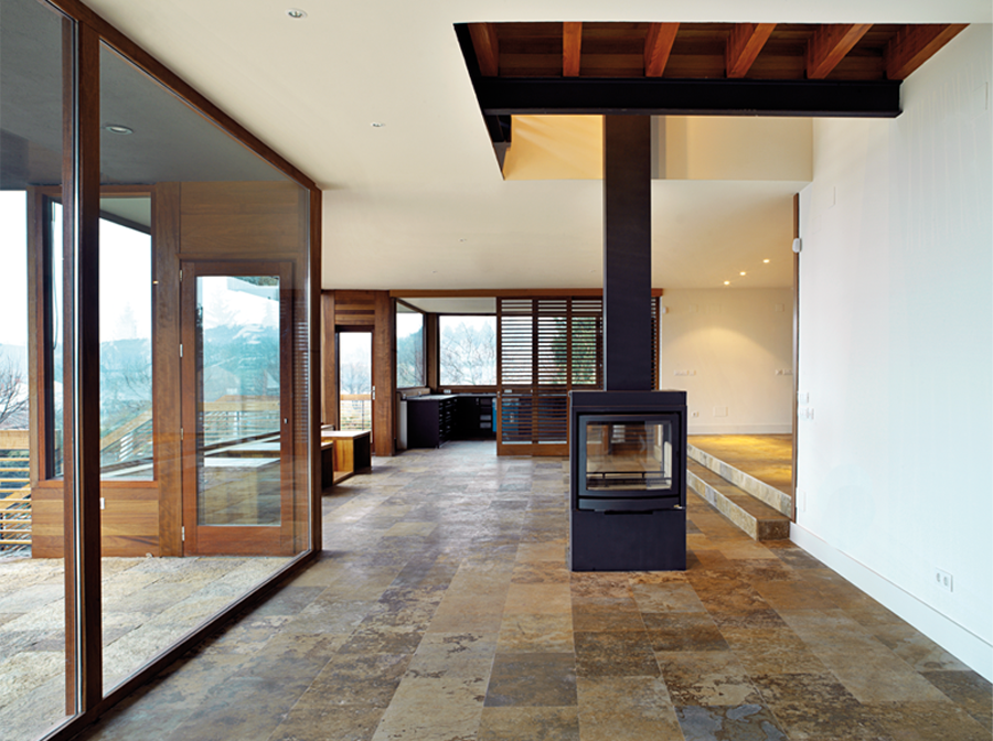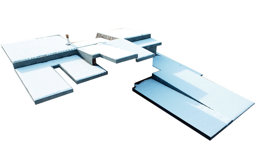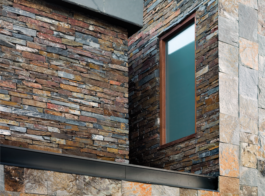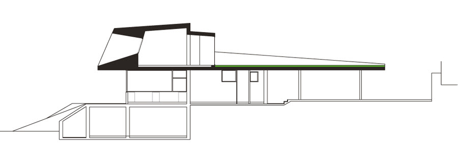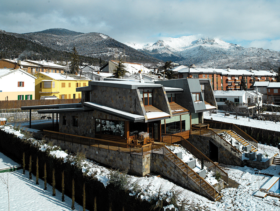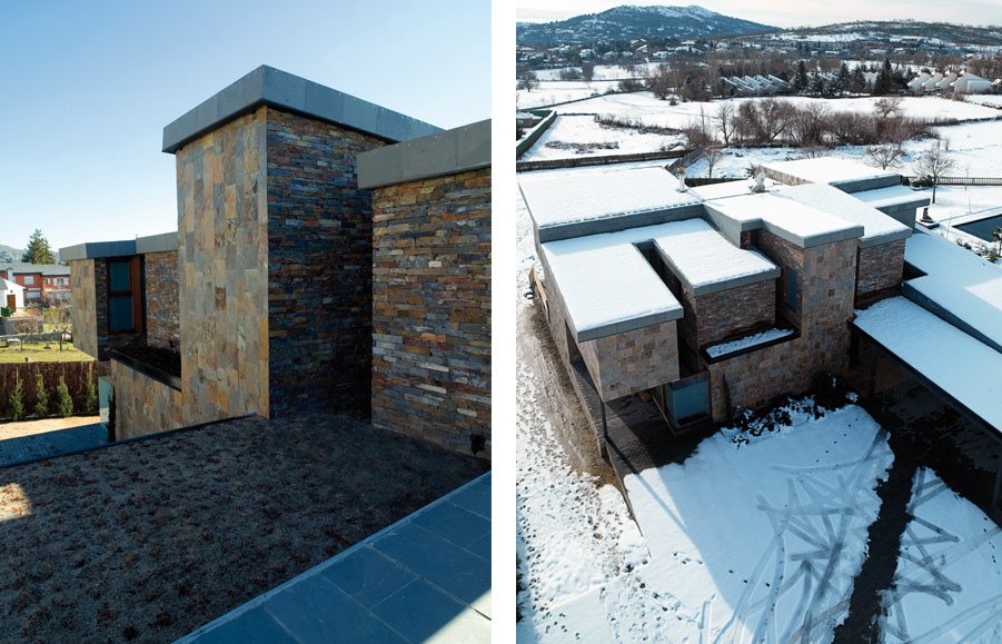 These two different facades are covered by an almost flat covering of black slate, with gradients less than 8%,on which one could walk. Recognition of the traditional slate roofs in the surroundings, which have gradients higher than 20%. A place where snow accumulates and which can increase thermal inertia of the roof.