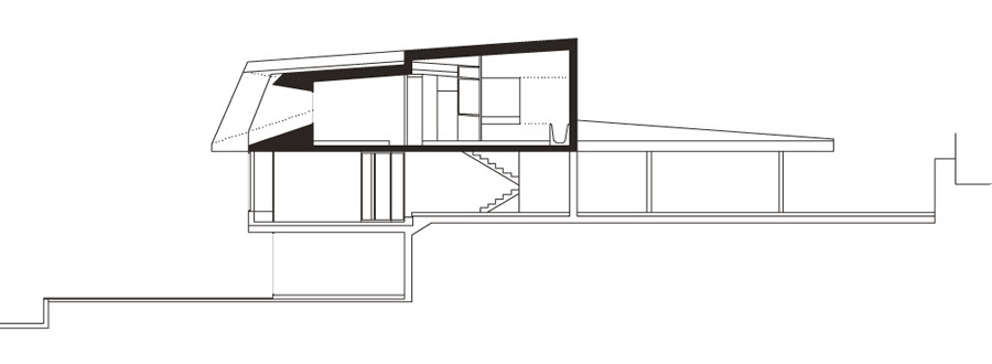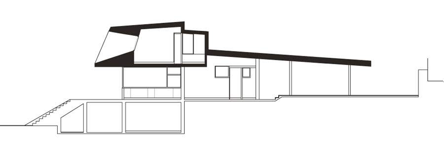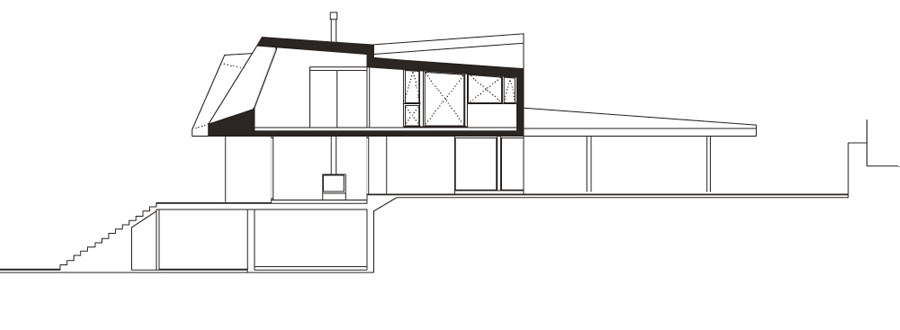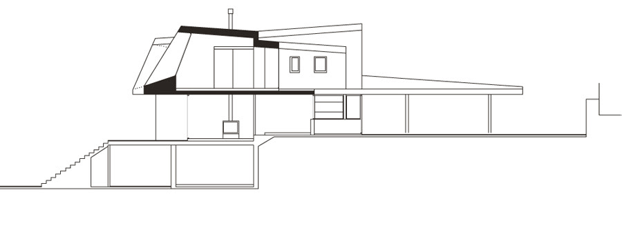 The front towards the south: some corbels generating large areas with glass walls on the ground floor creating porches and offering superb views of the reservoir glistening in the southern light.