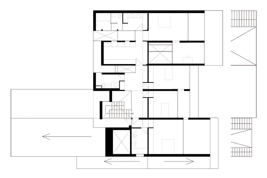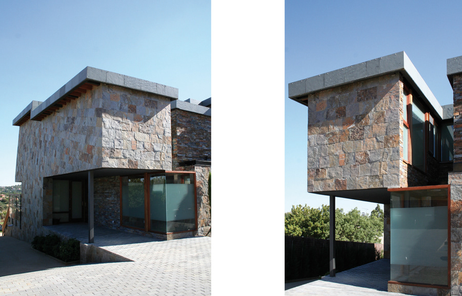 The back towards the north: outlined by a series of vegetable courtyards seeking privacy and light in relation to the different level of the street. The skin of stone changes in texture according to its location and completely covers the back of the house. The opaque skin is intertwined.
